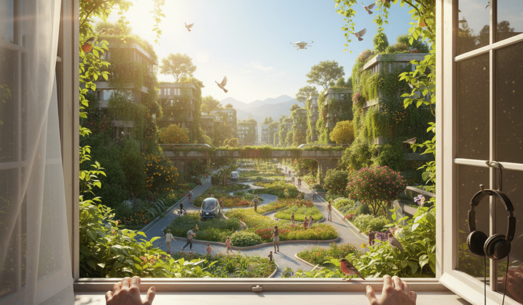 Sa vaatad aknast välja ja linn on märkamatult muutunud. See ei ole enam betoonist ja asfaldist džungel. See on aed. Majade vahel on pargid, kogukonnaaiad, rohelus on võtnud võimust halli üle. Loodus ja loodu on lõpuks ometi ära leppinud ja elavad õnnelikult koos.