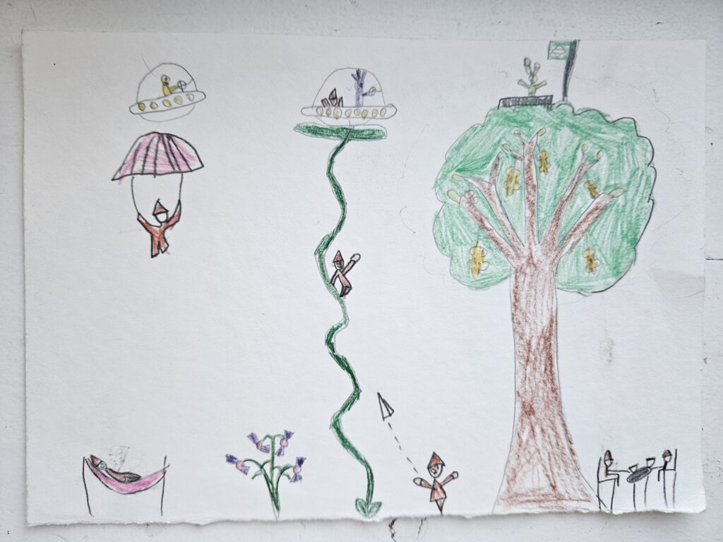 Suur roheline puu, mille okstel kasvavad lapsed või kuldsed tegelased, näitab, et tuleviku ühiskond väärtustab mängulisust ja looduse sümbioosi. Lapsed kasvavad sõna otseses mõttes puu otsas – see võib tähendada, et haridus, lapsepõlv ja vabadus on omavahel seotud. Võib-olla õpitakse tulevikus rohkem vabas looduses, puude otsas või elades koos keskkonnaga, mitte selle kõrval.