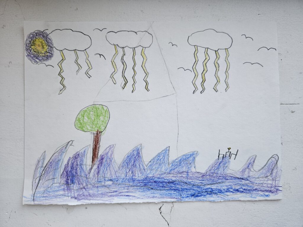 Mere kohal hõljub ka väike must objekt – see võib olla droon, vaatlusrobot või väike uurimissond. See viitab sellele, et ka 2050. aastal jälgitakse ilma ja merd kõrgtehnoloogia abil, et mõista keskkonda paremini ja reageerida vajadusel kiiresti. Inimese ja looduse vaheline koostöö on siin joonistuses vaikne, aga sügavalt tunnetatav.