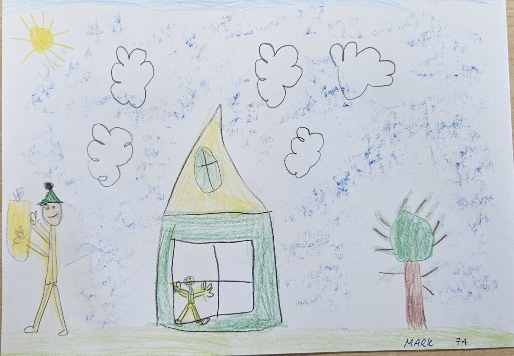 Paremal pool kasvab puu, mille roheline võra ja pruun tüvi lisavad pildile elujõudu. Muru ja loodus ümber maja viitavad sellele, et 2050. aastal on keskkond hästi hoitud, õhk puhas ning rohelust leidub kõikjal. Selline tulevik tundub rahulik ja turvaline – koht, kus kodud on looduse keskel ning elu kulgeb aeglaselt, ilma liigse kiirustamiseta.