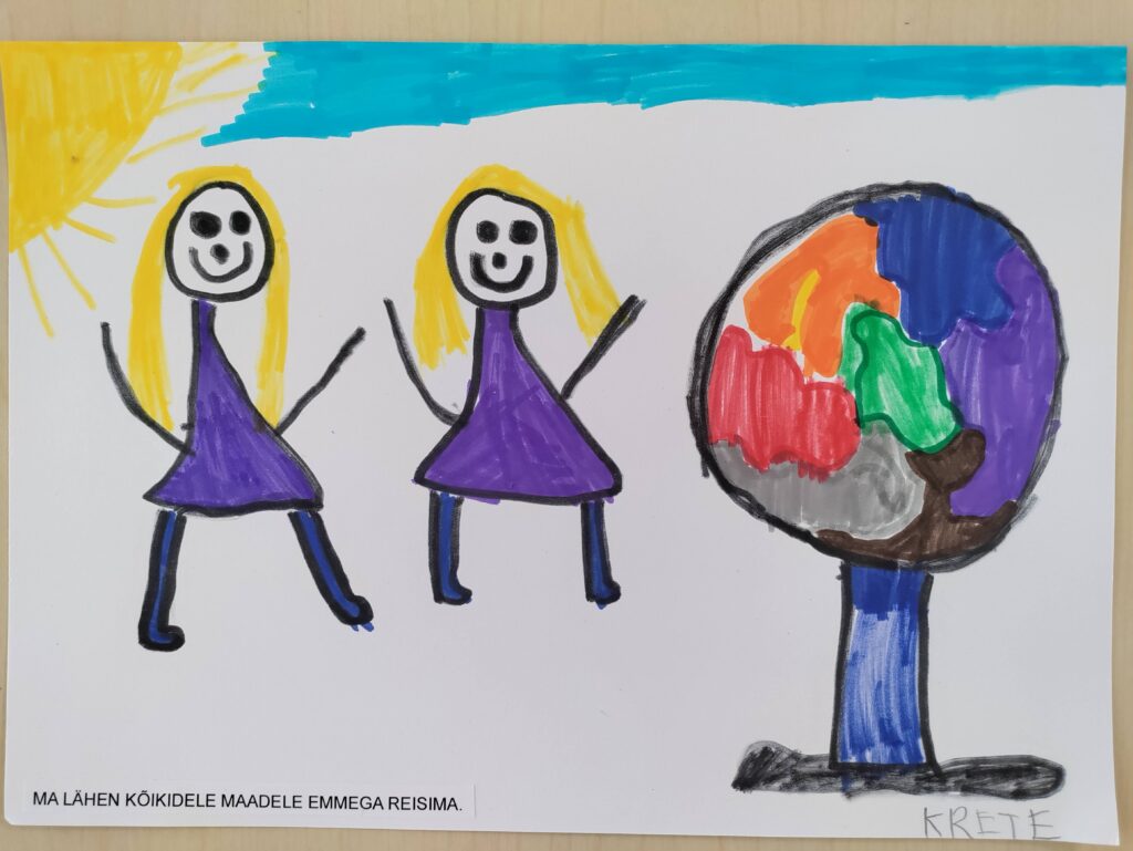 Sellel pildil on kujutatud unistus suurest seiklusest – reisida koos emmega kõikidele maadele. Vasakul paistab ere päike ja taevas on helesinine, mis loob rõõmsa ja sooja meeleolu. Kahe pikade blondide juustega inimese näod on naerul ning nad kannavad lillat värvi kleite, justkui valmis koos rännakule asuma.