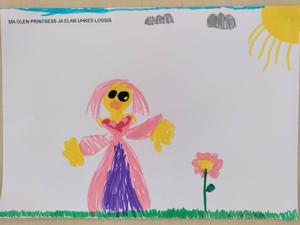 Sellel pildil on kujutatud unistus, kus autor on printsess ja elab uhkes lossis. Päike paistab ülevalt paremal, taevas on heledsinine ja seal on mõned hallid pilved. Roheline muru katab maad ning sellel kasvab üks ilus roosa lill, mis lisab pildile õrnust ja värvi.