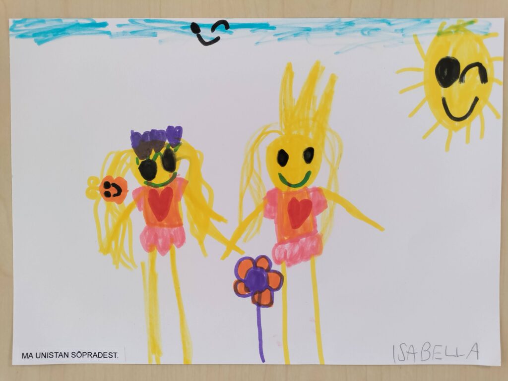 Sellel pildil on kujutatud rõõmus ja värvikas unistus sõpradest. Kahe päikseliste juustega inimese näod on naerul, neil on seljas roosad riided ja südamekujulised mustrid rinnal, mis sümboliseerivad hoolivust ja armastust. Nad hoiavad käest kinni, mis näitab tugevat sõprust ja ühtekuuluvust.
