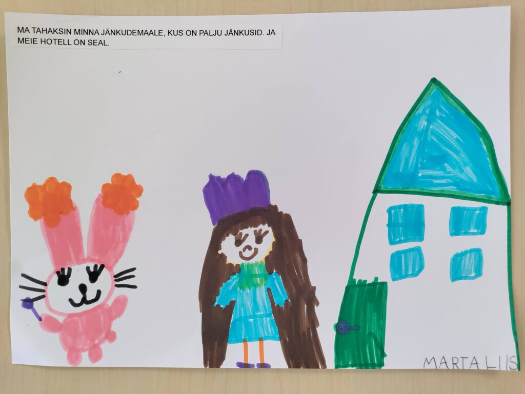 Sellel pildil on kujutatud unistus reisist Jänkudemaale, kus on palju jäneseid ja kus asub ka pere hotell. Vasakul seisab rõõmus roosakas jänes suurte oranžide kõrvakaunistustega, mustade vurrude ja laia naeratusega. Ta hoiab käes väikest lillat eset, võib-olla maiust või mänguasja.
